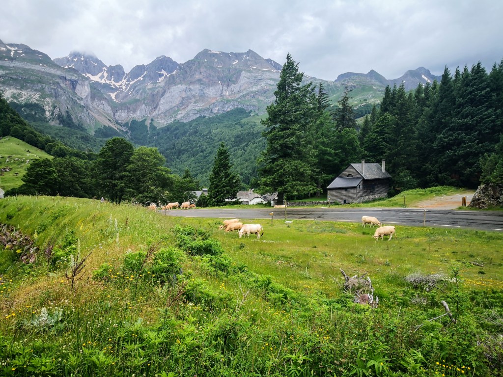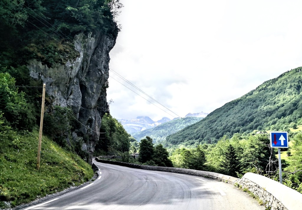 Buiten Urdos fietsen we in eerste instantie mee met het verkeer richting tunnel. De tunnel is echter verboden voor fietsverkeer. Na enige tijd geven de ” gendarmes” aan dat het voor de Col du Somport, hier de afslag nemen is. Ze zijn zeer vriendelijk en behulpzaam. “Het is wel erg steil”, waarschuwen ze me. Ze kijken enigszins bezorgd naar mijn zwaarbeladen fiets.