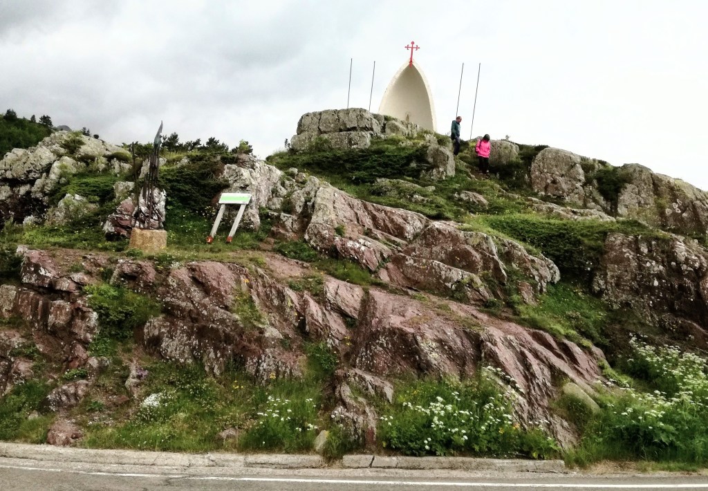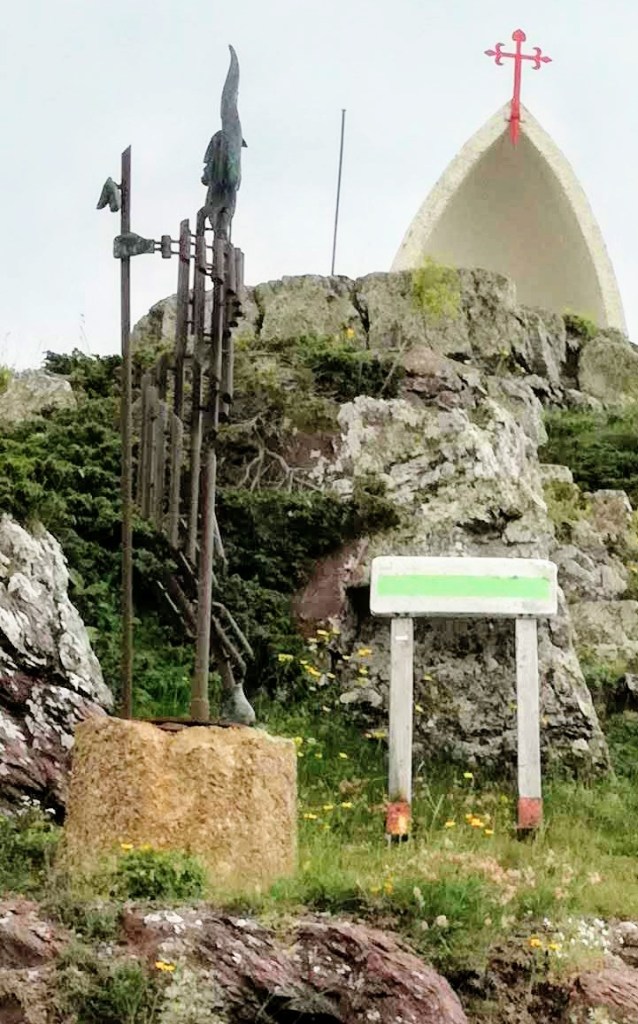 Het weer wordt plots heel bewolkt ik besluit in de cafetaria aan de Spaanse kant even een verfrissing te nemen, alvorens de afdaling aan te vatten. Aan de overzijde valt een monument met Caminosymbolen me op. Het is duidelijk Camino heeft in dit gedeelte van Spanje een belangrijke plaats.