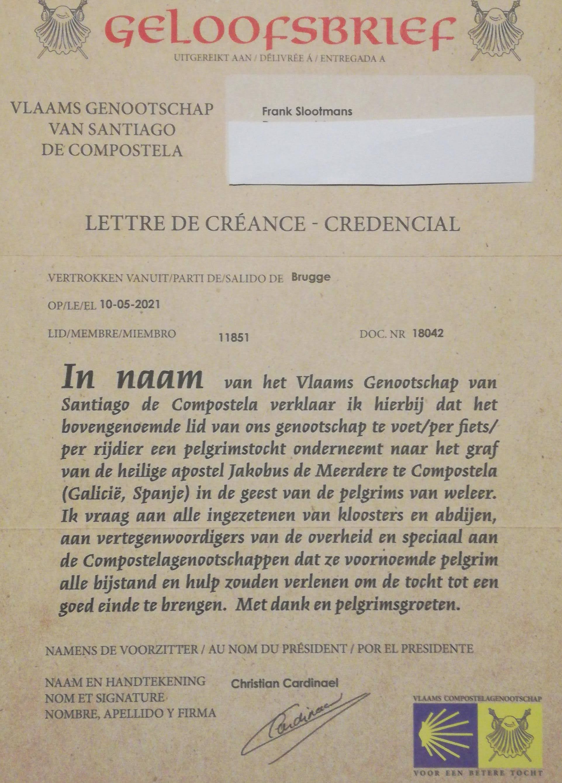 Recent de Geloofsbrief en Credential ontvangen van het “Vlaams Genootschap van Santiago de Compostela”