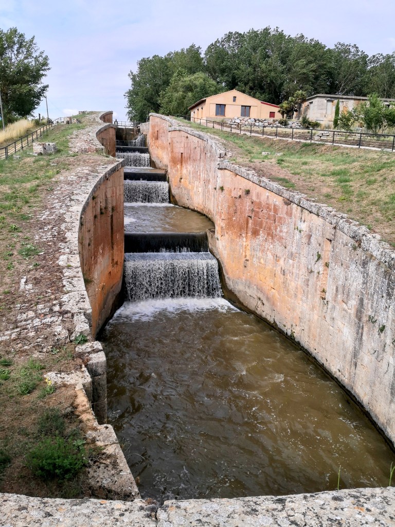 Net voor Fromista kruisen we een indrukwekkende constructie gebouwd in de 18de eeuw, een onderdeel van het sluizencomplex van het Canal de Castilla nodig voor de irrigatie.