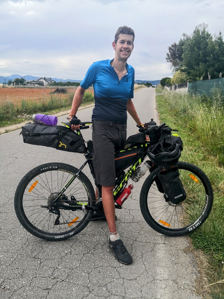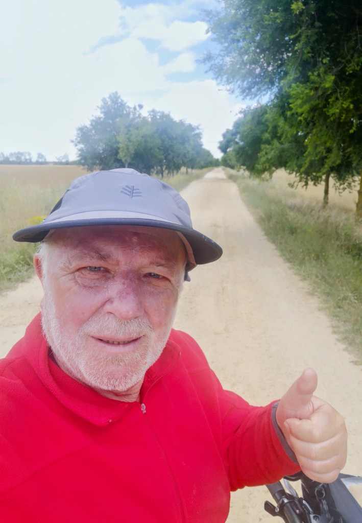 Deze jonge Oostenrijkse fietser die met frisse onbezorgdheid van Lausanne onderweg is naar familie in Portugal. Volledig onvoorbereid maar wel met heel veel positiviteit en goesting geeft hij aan hoe het ook kan. Respect voor hoe iedereen zijn Camino aanpakt.