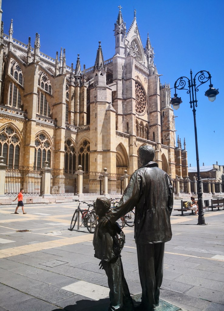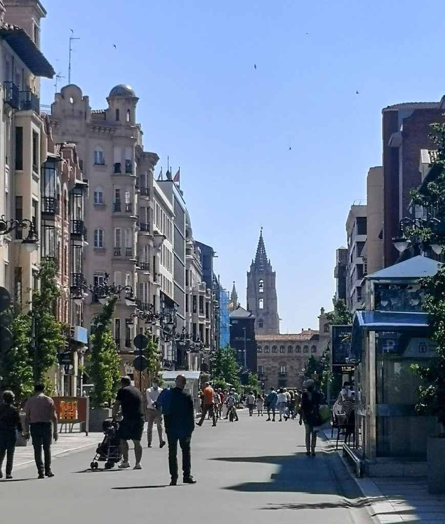 Deze ochtend even de stad verkennen. Gelukkig heb ik in de rustplaatsten, waar mogelijk, steeds een verblijf dicht bij het centrum gezocht. Via de rotonde met het indrukwekkende standbeeld van Ordoño II wandel ik via de hoofdlaan richting Kathedraal.