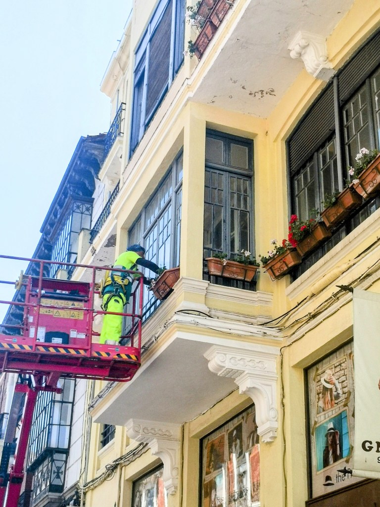 Stadsdiensten zijn druk in de weer om huisgevels te behangen met overladen bloembakken.
