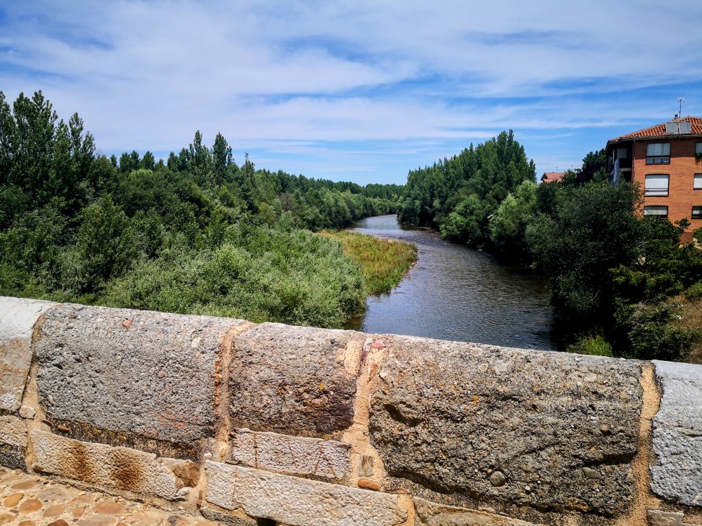 Na Castrojeriz rijden we weer door wijdse landschappen waarin pittige heuvelruggen na elke top weer een verrassing toveren. Zo dalen we af naar de Rio Pisuerga en de middeleeuwse brug met 12 bogen. Houd hier even halte om in de groene schaduw even te genieten van intimiteit en stilte. Even geen wind die in mijn oren alle toonaarden fluit. Wel moeilijk om vanaf de route een goede overzichtsfoto te nemen, dan maar een zijaanzicht.