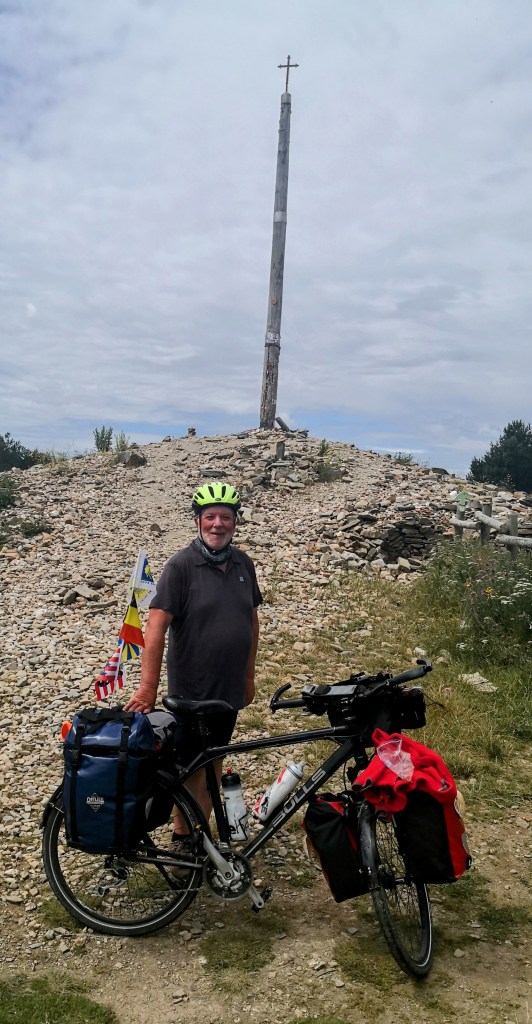 Vertrekkend vanuit Rabanal is het voortdurend klimmen naar 1500m. Het landschap wordt kaler en meer heideachtig. Na een stevige klim die ik nagenoeg volledig heb kunnen fietsen kom ik aan bij Cruz de Ferro. Had me vooraf voorgenomen te proberen maximaal ”op de fiets” naar boven te klimmen en geklauter met de “fiets aan mijn zij” te beperken tot het hoogst nodige.