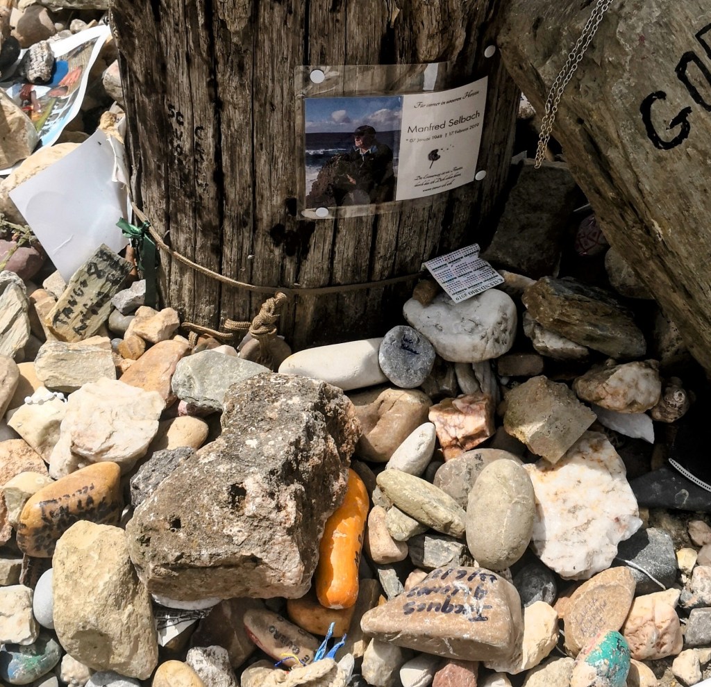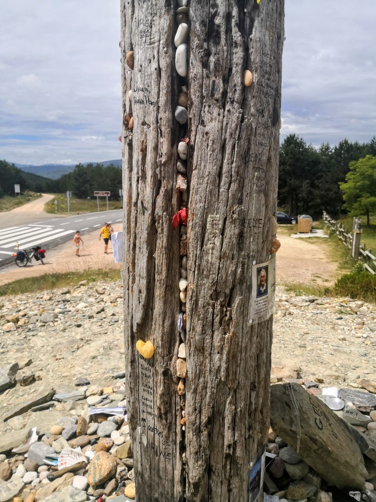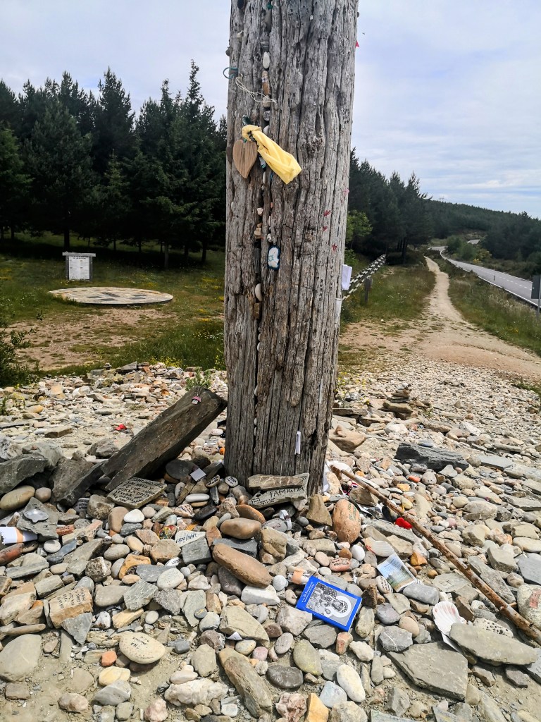 Er waren weinig andere pelgrims. Wanneer ik naar boven stap om de steentjes neer te leggen kraakt de ondergrond bij elke voetstap. Besef goed dat ik ga over een spiritueel monument. Als ik de top bereik en alle steentjes, foto’s, kaartjes en briefjes zie liggen aan de voet van de boomstam of geplooid of geduwd werden tussen de scheuren in het hout, voel ik emotionele rimpels.