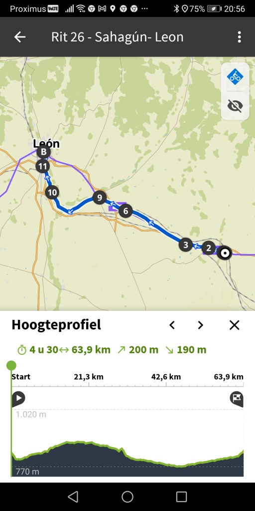 1 juli 2021: Vandaag rit gepland van 78,5km. In werkelijkheid heb ik er 75,1 km afgelegd. Ben na Hospital de Orbigo rechtstreeks naar Astorga opgestoomd via de EV3.