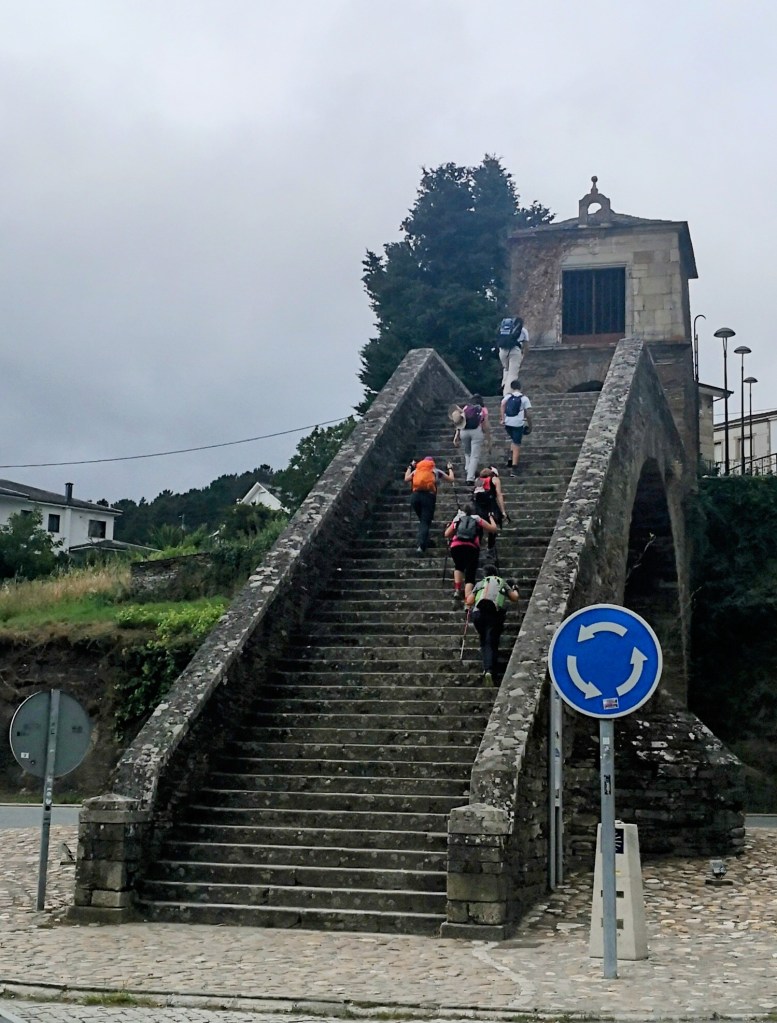 Eerst even uitrusten voor de stenen brug waar ik de Caminostappers enthousiast in de voetstappen zie treden van hun voorgangers.