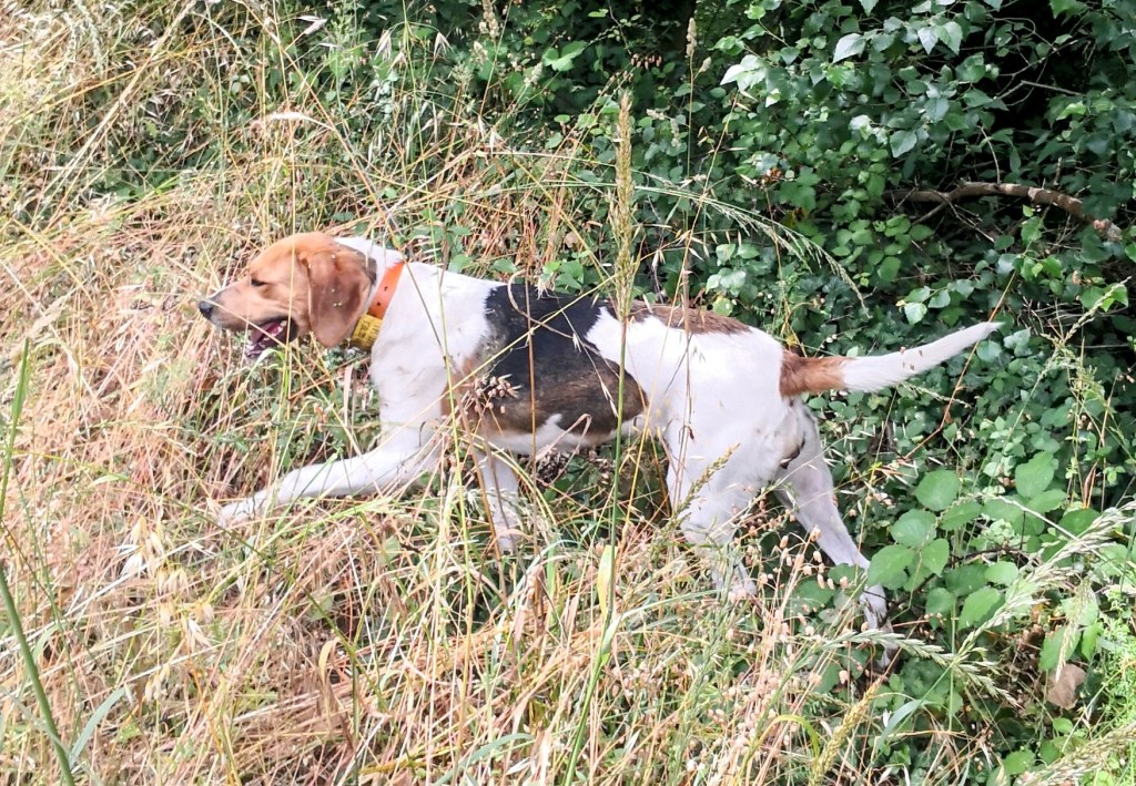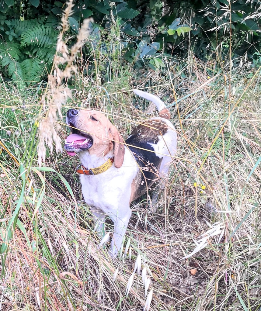 Zij herhaalt dit voortdurend en geraakt meer en meer volledig buiten adem. Zij ligt dan uitgeteld in het hoge gras en kruipt dan moeizaam recht omdat zij me absoluut wil blijven volgen.