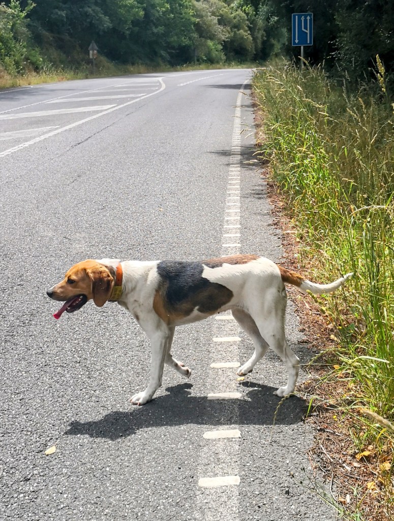 De hond, een teefje, blijft voortdurend bij me. Moet ik bij erg steile stukken, naast mijn fiets stappen, dan loopt zij voor me, me nakijkend of ik wel volg. Zijn er afdalingen dan is zij uit het zicht omdat zij me niet kan volgen. Echter bij de eerstvolgende klim, hoor ik haar in de verte hijgend spurten om me in te halen. Als zij dan bij me komt is zij uitgeput.