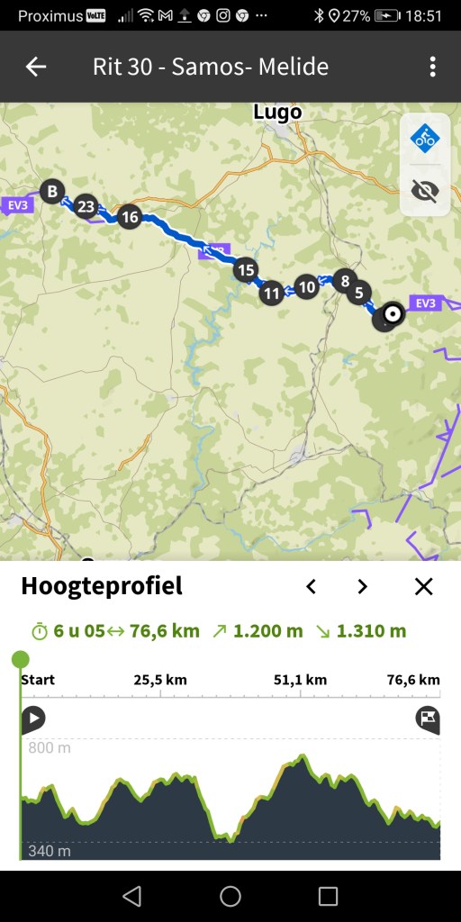 27 juni 2021: Vandaag een rit gepland van 77,3 km. Uiteindelijk heb ik er 73,1 afgelegd na enkele routeaanpassingen waarbij ik zoals ook bij enige vorige routes, de klassieke Caminoroute volg ipv van de route van Sweerman.