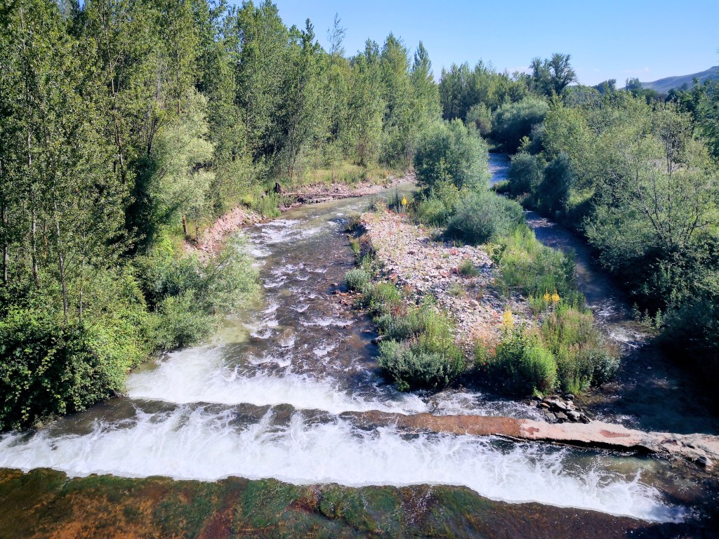Na Castrojeriz rijden we weer door wijdse landschappen waarin pittige heuvelruggen na elke top weer een verrassing toveren. Zo dalen we af naar de Rio Pisuerga en de middeleeuwse brug met 12 bogen. Houd hier even halte om in de groene schaduw even te genieten van intimiteit en stilte. Even geen wind die in mijn oren alle toonaarden fluit. Wel moeilijk om vanaf de route een goede overzichtsfoto te nemen, dan maar een zijaanzicht.
