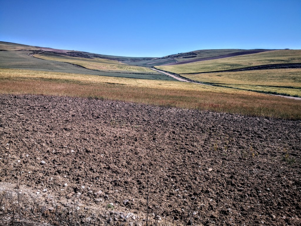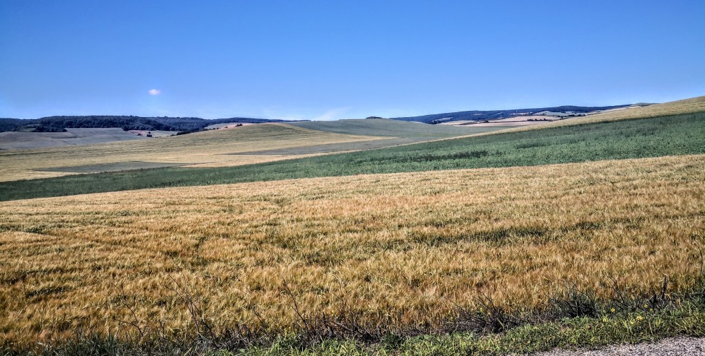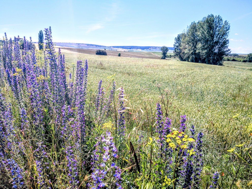 We zetten onze tocht, door de hoogvlakte Tierra de Campos, verder. Een eindeloos landschap met glooiende graanvelden. Nietige fietsers en stappers in deze enorme golvende vlakten. Een frisse westenwind fluit een deuntje in mijn oren. Stille dorpjes met weinig voorzieningen testen onze paraatheid.