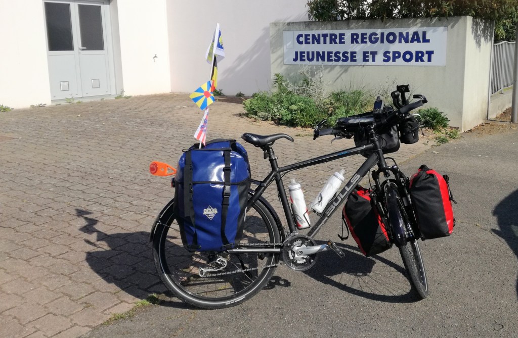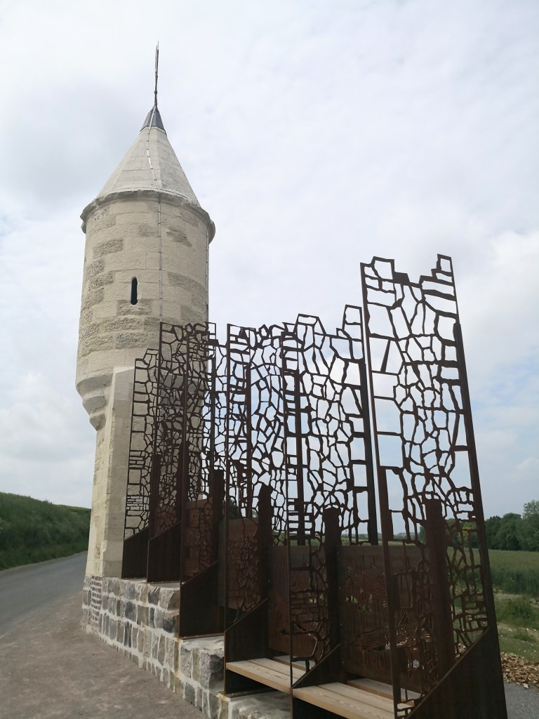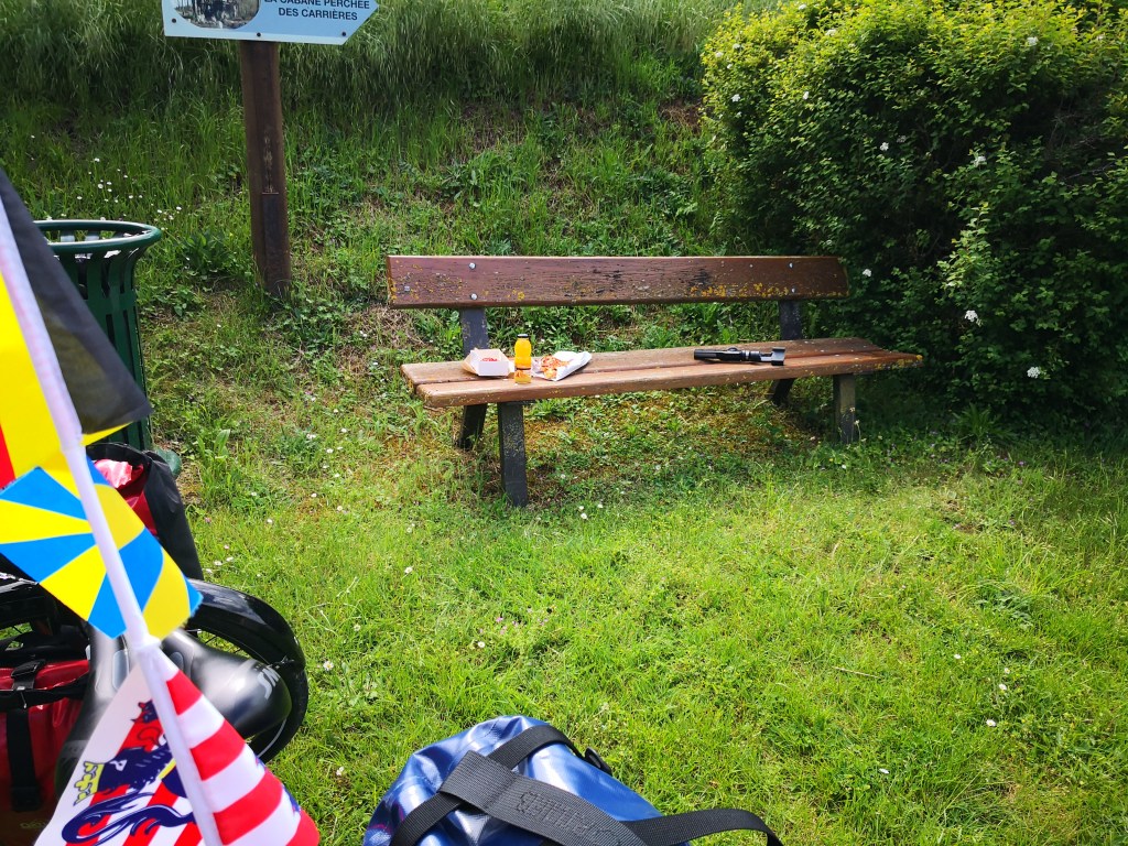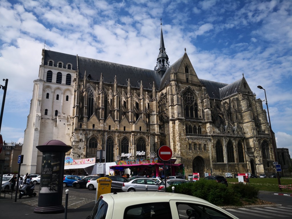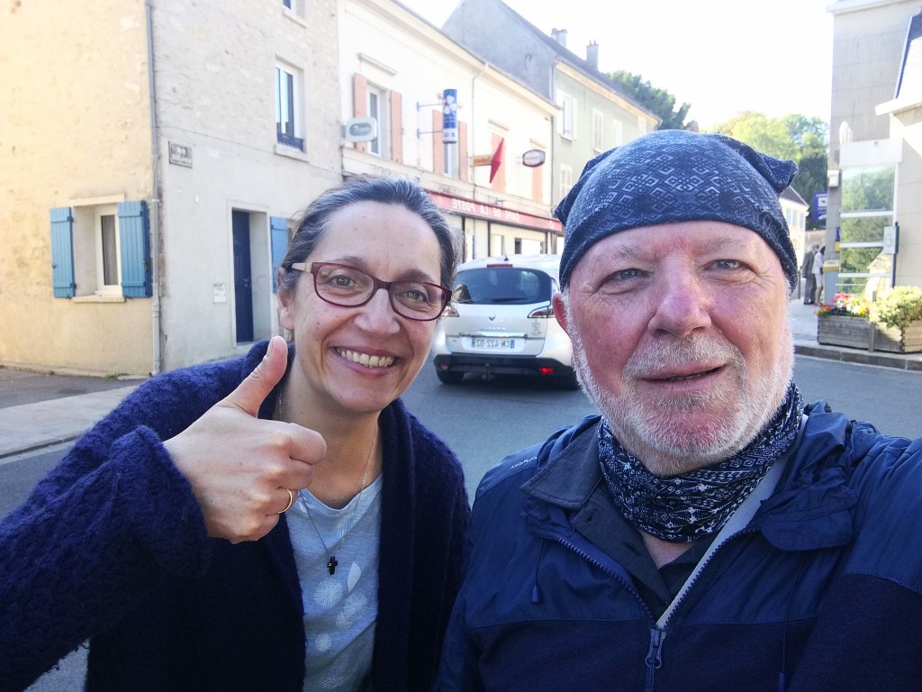 Voor ik “en route” vertrek eerst een kort bezoekje aan de Kathedraal, hoop daar mijn dagelijkse stempel te kunnen krijgen. De Kathedraal imponeert vanuit de hoogte. Ik moet een keuze maken, ofwel een iets gemakkelijke klim, maar langer, of een meer directe klim, maar veel zwaarder. Kies voor de korte pijn. Met de fiets aan mijn zijde, klauter ik naar boven, onderweg aangesproken en gemotiveerd door een iets oudere dame. Ze zei me:” Ben lid van de liturgische raad van de Kathedraal, wil je gerust een en ander vertellen over dit monument. Respect voor je pelgrimage”. Ik zeg haar dat ik de Kathedraal graag kort wou bezoeken en mijn stempel halen, maar dat ik moeilijk mijn fiets alleen kan achterlaten. “Geen probleem” zegt ze me “ik zal wel op je fiets letten”. Ondertussen vertelt ze me mooie verhalen over een opvallende gerestaureerd torentje. “Hier zullen de schatten bewaard worden” zegt ze me. En over het blauw van de glasramen van Chartres dat niemand ooit heeft kunnen evenaren.